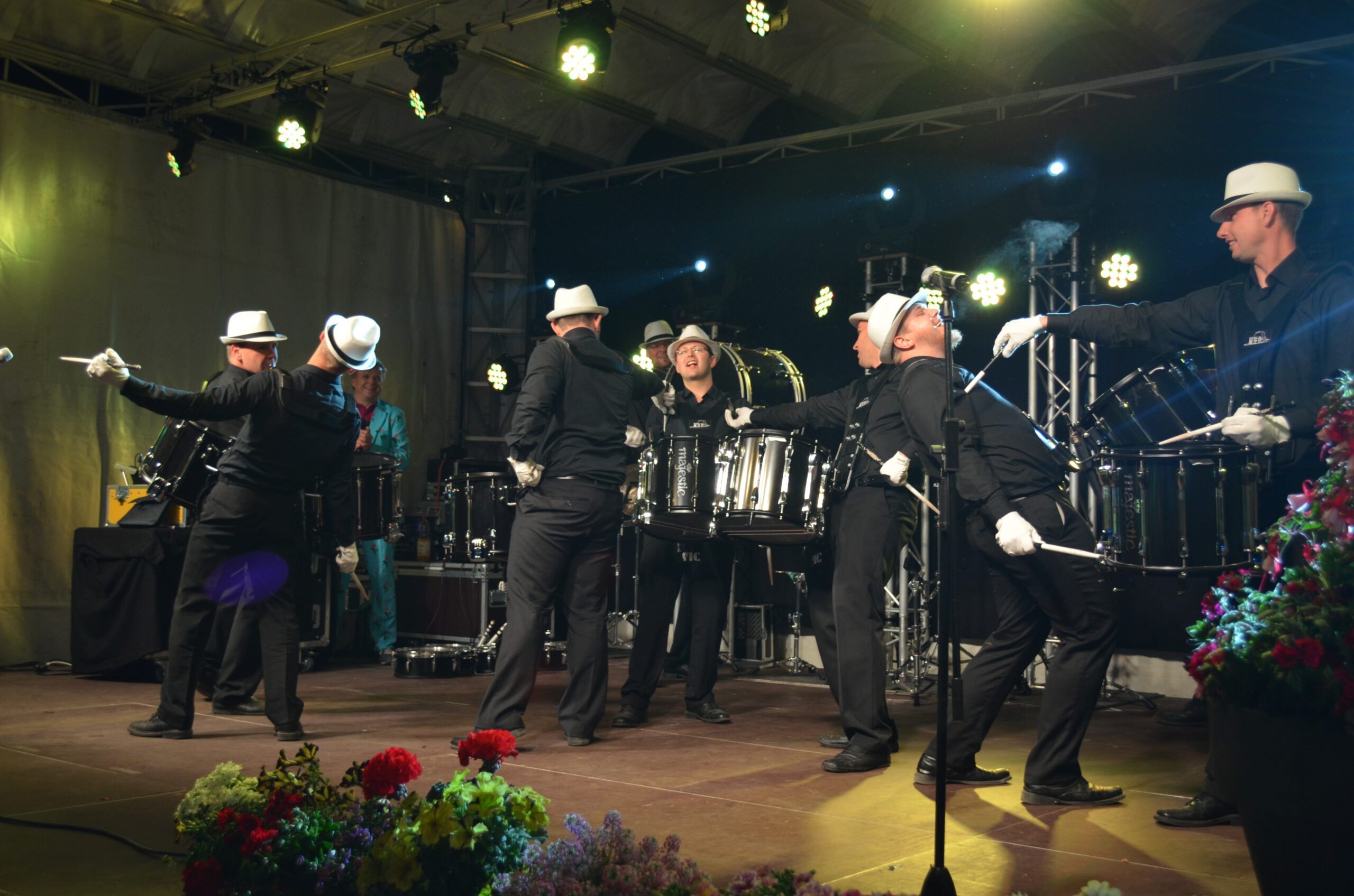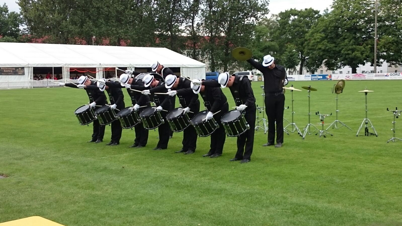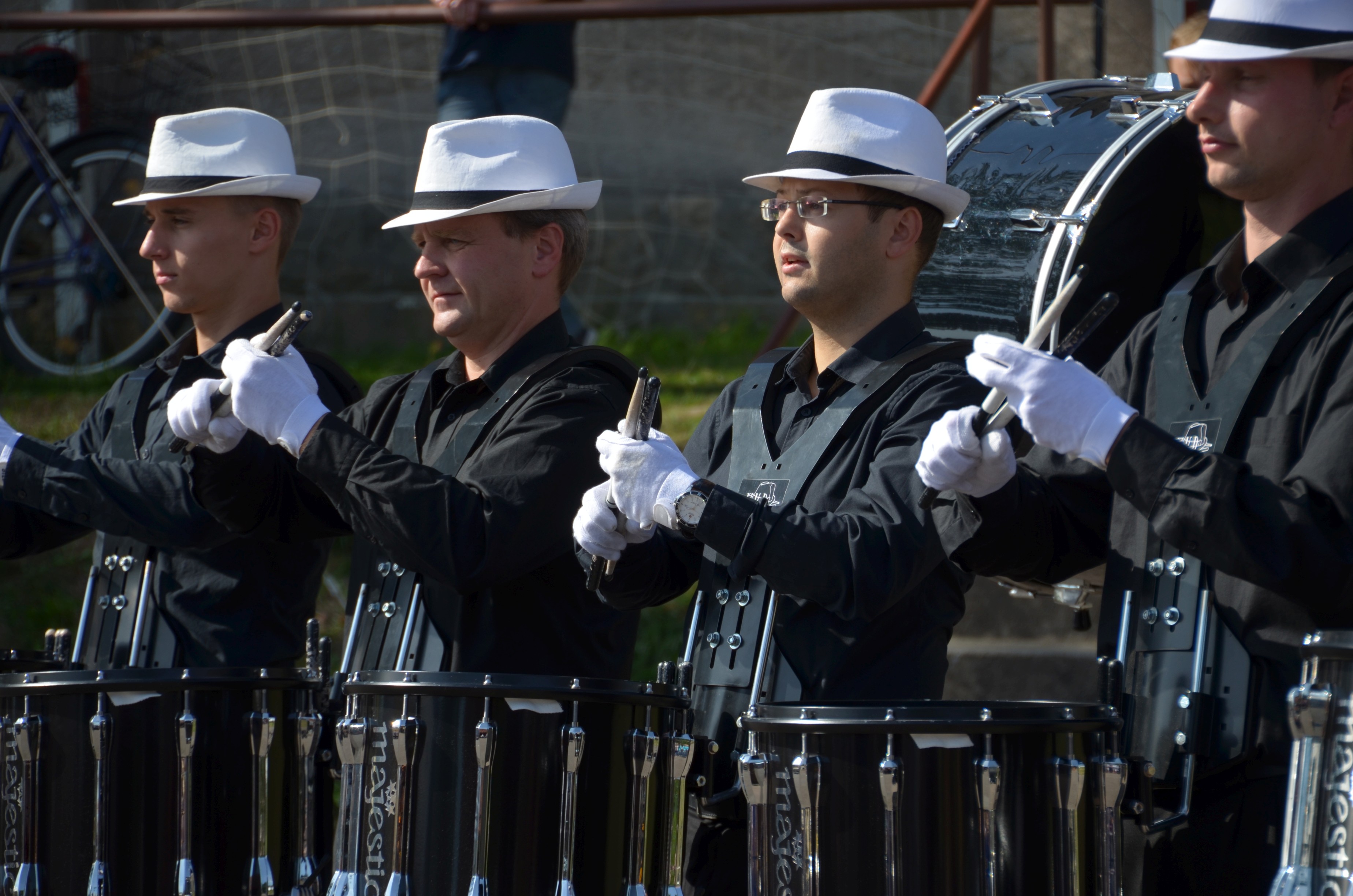 Auf dies Idee des Outfits, samt weißer Handschuhe, kamen wir bei den Überlegungen, wie die verschiedenen Bewegungen noch besser zur Geltung kommen könnten. Als schließlich der Satz fiel: “…denn schließlich seien wir ja so etwas wie trommelnde Pantomime-Darsteller…” war die assoziative Brücke schnell geschlagen. Das war die Geburtsstunde der “WHITE HAT DRUMMERS”.