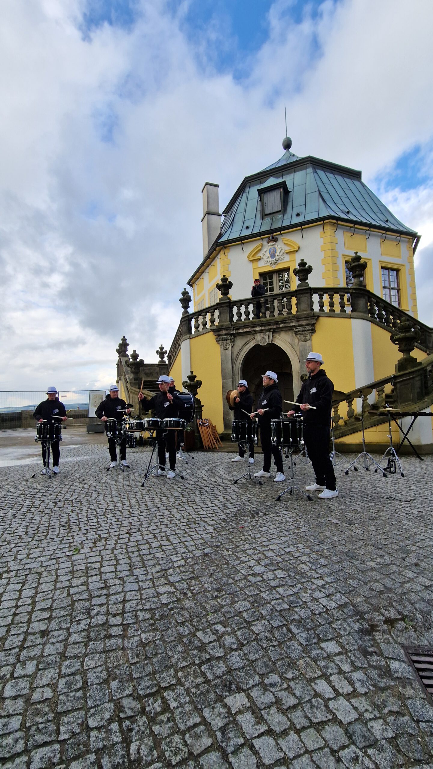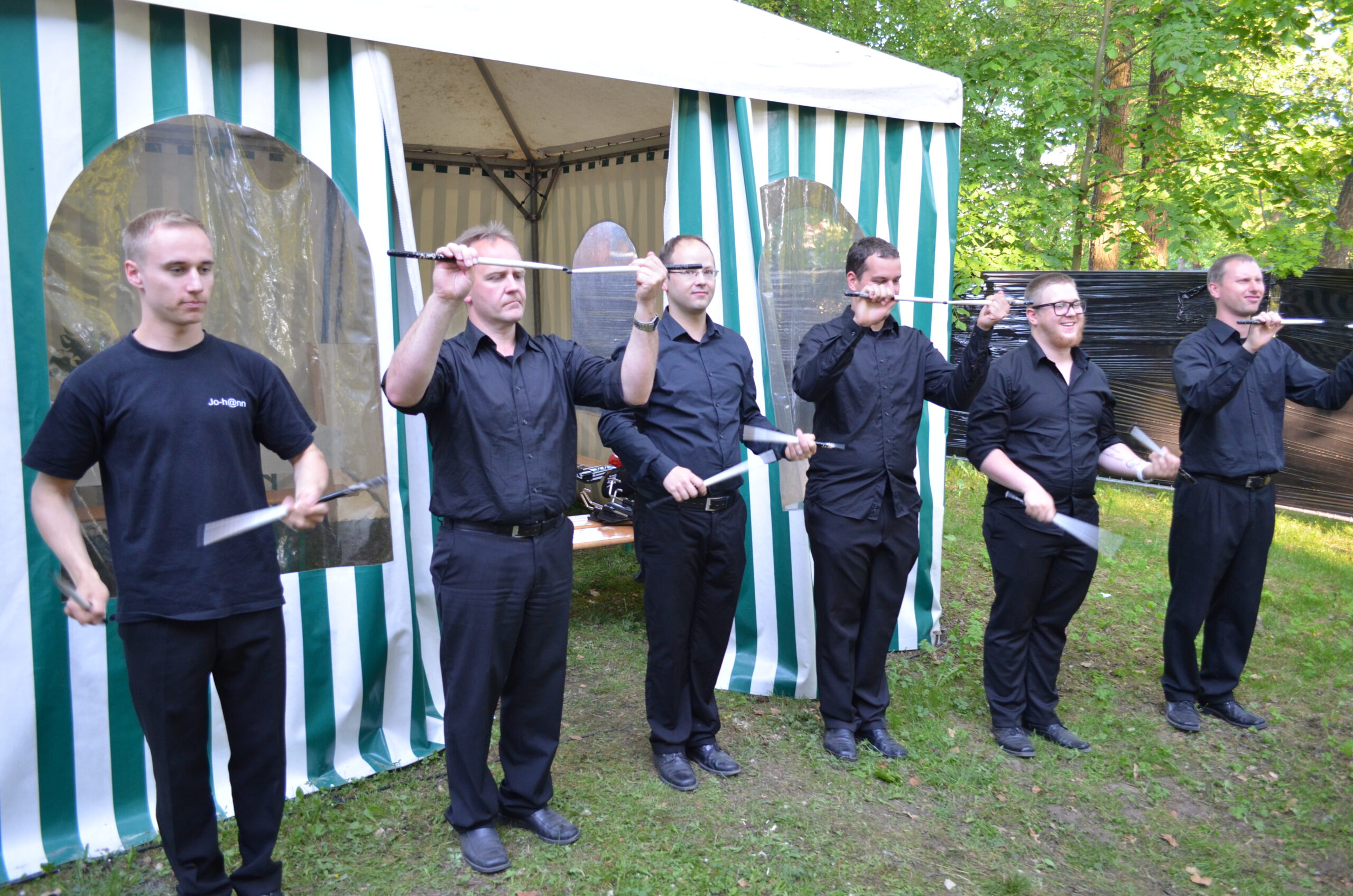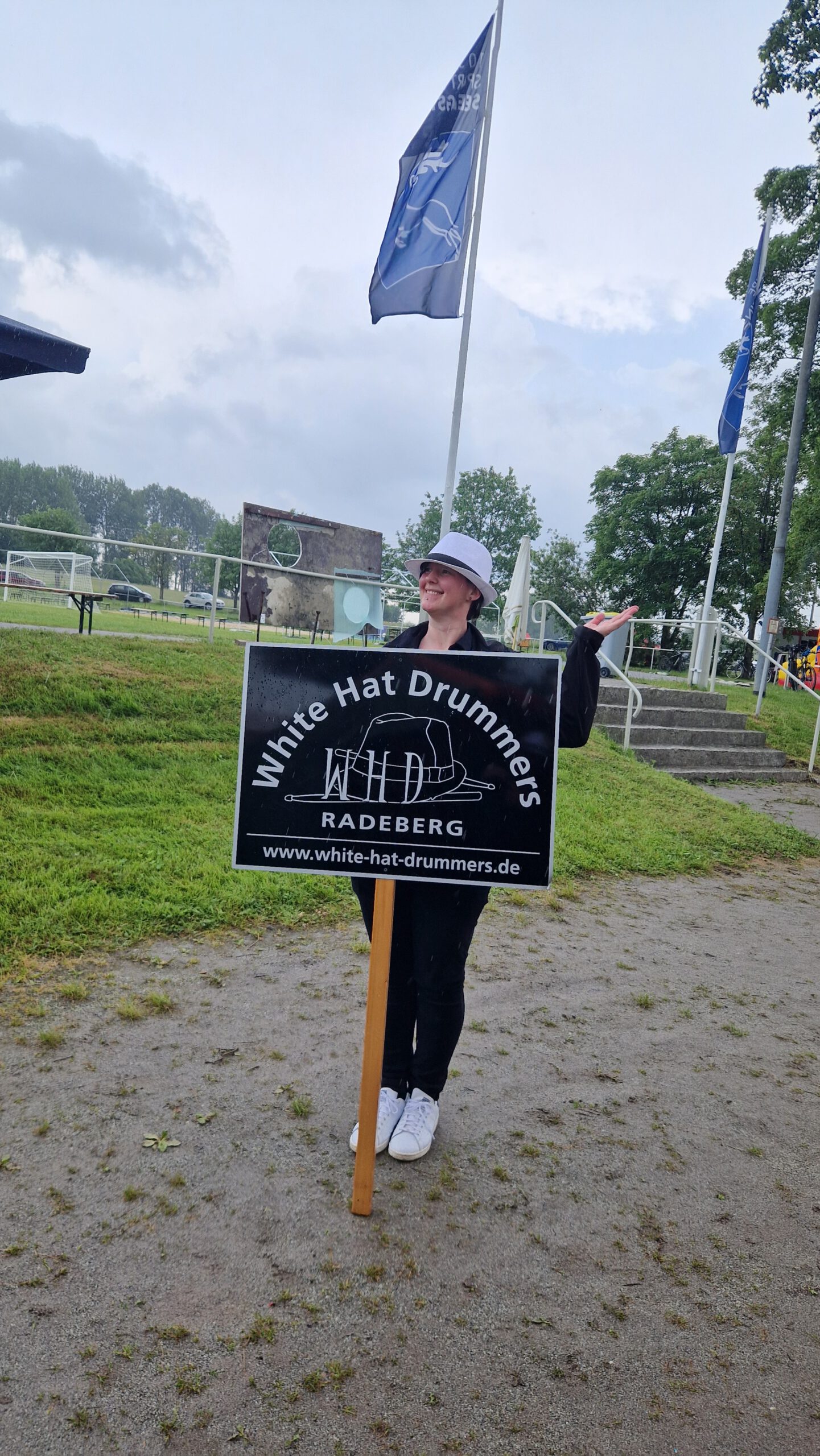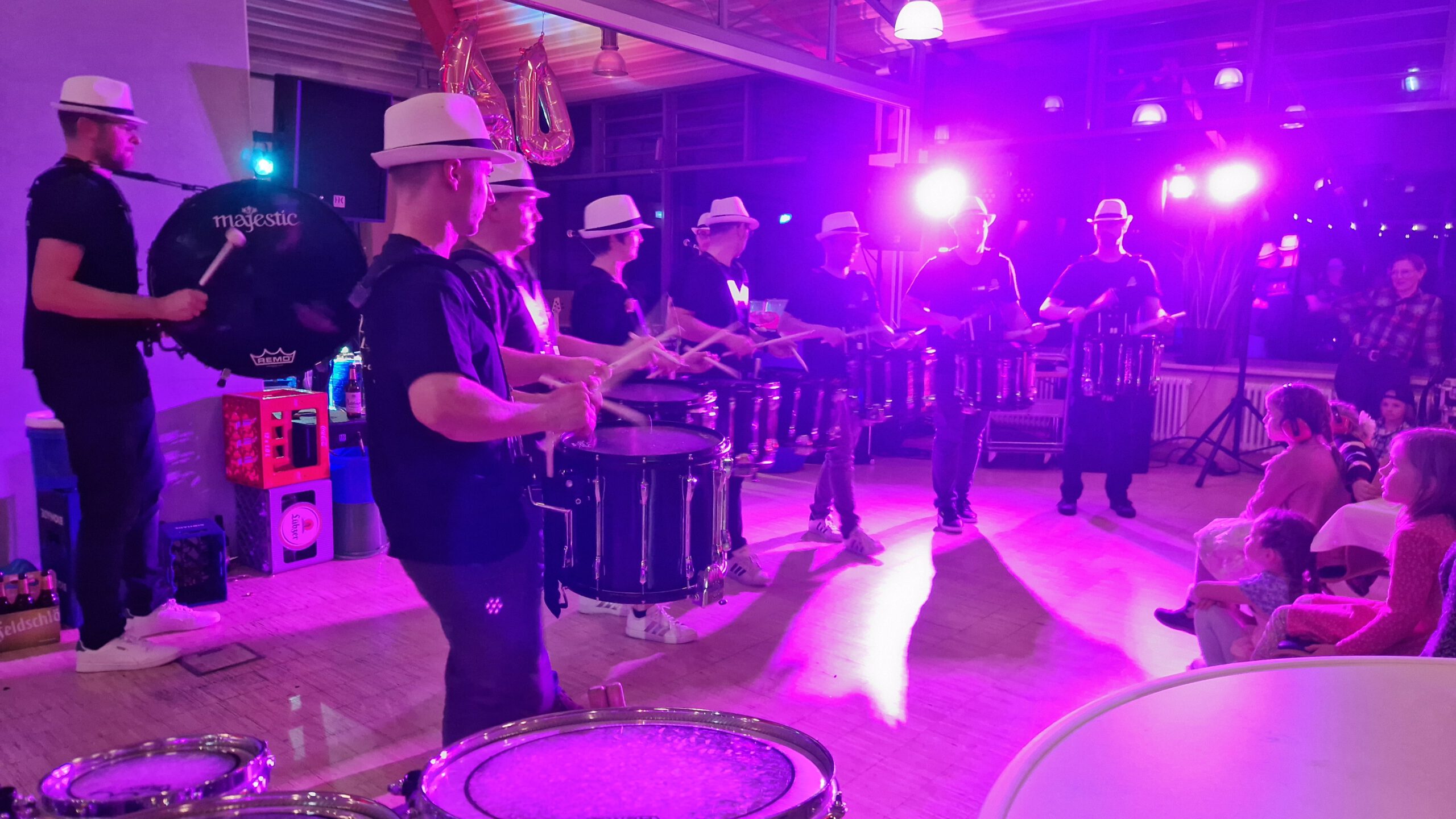 Auf dies Idee des Outfits, samt weißer Handschuhe, kamen wir bei den Überlegungen, wie die verschiedenen Bewegungen noch besser zur Geltung kommen könnten. Als schließlich der Satz fiel: “…denn schließlich seien wir ja so etwas wie trommelnde Pantomime-Darsteller…” war die assoziative Brücke schnell geschlagen. Das war die Geburtsstunde der “WHITE HAT DRUMMERS”.